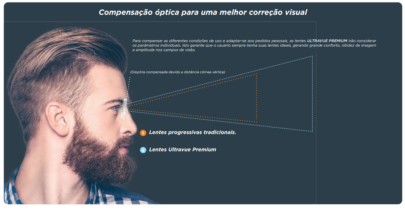 Corredor Progressivo - Com prioridade para presbitas que buscam visão de perto e intermediária, dando mais conforto e amplos campos.